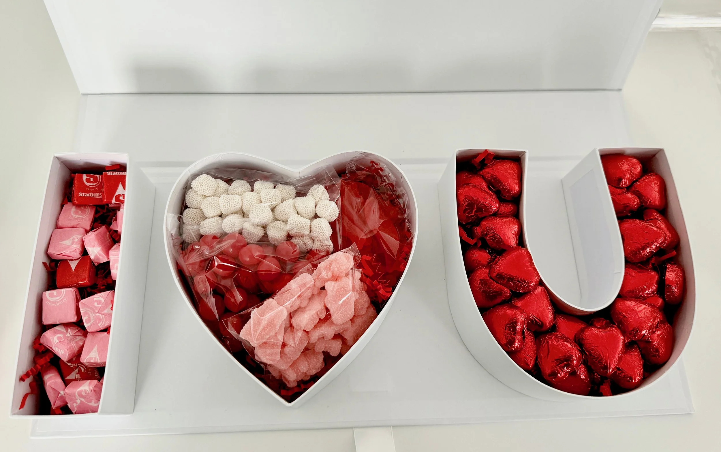 Surprise your Valentine this year with our I LOVE YOU gift box. Beautifully designed this box is filled with sweet treats including milk chocolate hearts, sour cherry chews, strawberry gummy bears, Swedish fish, Starbursts, and champagne bubblies. Finished off with a satin ribbon, this box is a gift by itself.